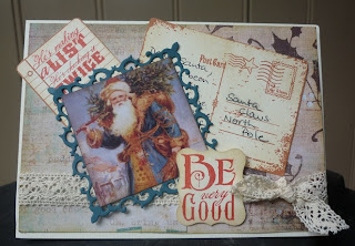 Then I made some vintage cards, using the new Waltzing Mouse stamps I received in the mail and a lovely Verve postcards stamp, with images from Meg's Garden Designs Galore series of 12 x 12 papers. Throw in some die cuts and lace, and background Figgy Pudding Christmas DP, some ribbon and sparkly numbers coloured with Copics and I had fun creating!