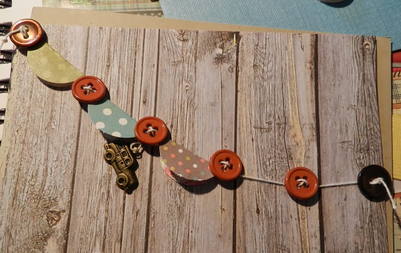 I then used buttons and twine and stitched the buttons down at each set, stringing the twine between each button.  I then used an SU 1" circle punch to get five circles from the paper pad scraps. I folded each circle in half and slipped them over the twine, gluing down the flap of the circle when in place. I also added a car charm while sewing. That was enough stitching for me!